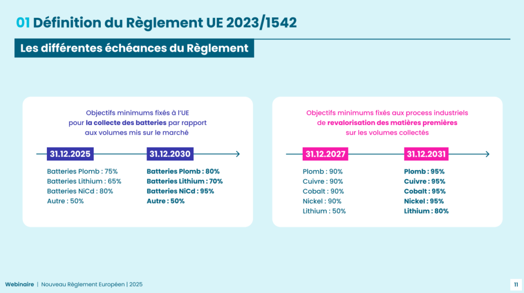 Conformément à l’article 56, Point 4 a) à d) du Règlement UE 2023/1542, les producteurs (fabricants, distributeurs et importateurs) soumis à la REP Batteries doivent couvrir les coûts relatifs à la gestion des déchets batteries et notamment la collecte et le traitement de celles-ci.